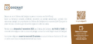 Le Château de Codignat organise un pot de l’amitié pour les habitants de la commune, le dimanche 2 novembre 2025, de 11h30 à 15h, avant la fermeture annuelle du site.